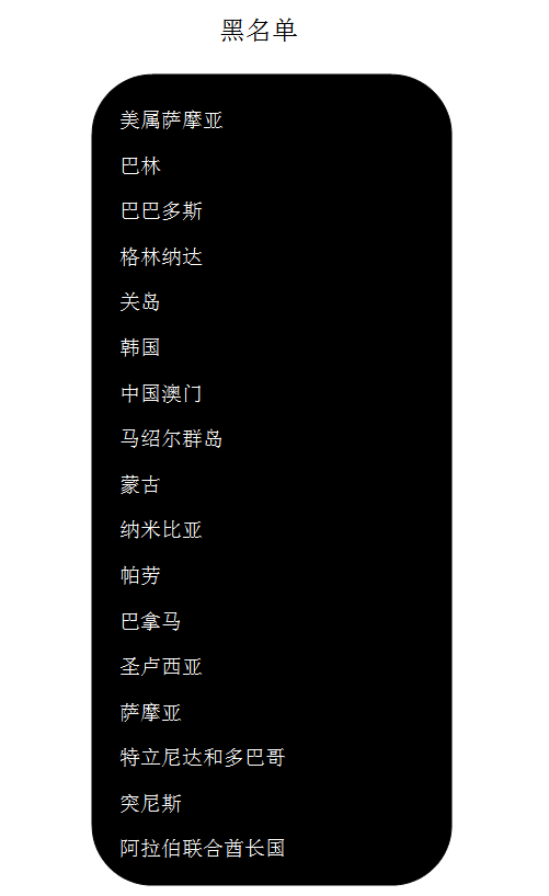 不合規(guī)的地區(qū)或國家被列入黑名單或顯示為灰色。第一份名單于2017年12月5日發(fā)布,當(dāng)時有17個國家和地區(qū)被列入黑名單。具體包括的國家和地區(qū)如下圖所示,馬歇爾赫然在列。
